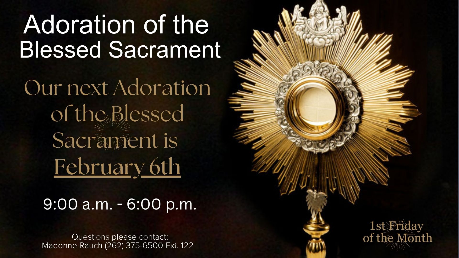 St. Joseph Catholic Parish The Hands of Christ... Open to All Mass & Prayer Schedule Parish Information Online Giving News & Events Community Service Formation Worship News and Events We Are HiringWork Where You Faith Is Apply HereCalendar of EventsMonthly View Click HereAdorationJanuary 2, 2026 To Learn MoreMonth of JanuaryHoly Name of Jesus To Learn More Here For More News and Events Click Here