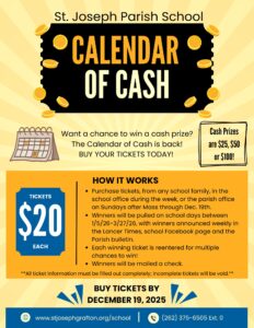 How do I buy raffle tickets? Tickets can be purchased in the school office from November 13 – December 19, 2025, from any school family, or after Sunday masses in the Parish Office. (1619 Washington Street, Grafton) School office: 262-375-6505 x0